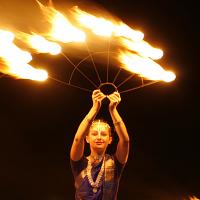 Мы крутим с Варей на первой линии, и я вижу, как она старается и как у нее все хорошо получается. Спиной я ощущаю Матвея, который крутит сзади нас, и знаю, что это самый надежный тыл. Когда зрители вопят вау! – я знаю, что это Матвей плюется огнем. Я бы тоже покричала вместе с ними – Матвей дышит огнем просто суперски! – но у меня сейчас другая роль. В какой-то момент, Варя путает направление кручения, и я жду, что будет дальше. Больше всего мне не нравятся такие моменты тем, что новички (а Варя выступает с огнем только второй раз) начинают паниковать. Варя пытается исправить свою ошибку, залепляет себе по спине, но это не мешает ей сохранять на лице то же счастливое выражение, и она спокойно продолжает номер. Я благодарна Варе, что она такая молодчинка, и вдохновения становится еще больше.