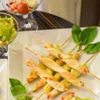 Кстати! Шашлычки можно завернуть в свежий огурец. Красиво получается. Надо повдоль разрезать огурец на длинные пластинки и слегка обжарить в масле. Пластинки получаются мягкие и легко скручиваются. Баклажан подойдет. Или кабачок.