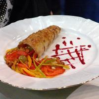 Освободить поджарившиеся полоски от форм, фаршировать их гарниром из винограда с перцем и грибами. Подавать под брусничным соусом.