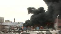Торговый центр объят пламенем, горение перекинулось на соседнее здание. Место пожара оцеплено ОМОНом, который не пускает в торговый комплекс продавцов, желающих спасать свой товар.