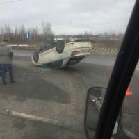 Сегодня в полдень в Твери на 173-м километре трассы М-10 женщина, управляя легковым автомобилем Toyota Camry, на большой скорости не справилась с управлением автомобиля. В результате Toyota наехала на бетонное ограждение, после чего опрокинулась на крышу.