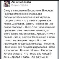 Например, в Фейсбуке она заявила, что рейтинг Петра Порошенко неожиданно «вырос в её глазах». К таким выводам Седокова пришла после того, как случайно услышала диалог двух своих попутчиков в самолёте.