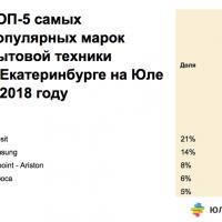 Самой популярной маркой в городе стала итальянская Indesit. На бытовую технику под этим брендом пришлось 21% продаж. Второе место по популярности в Екатеринбурге у корейской Samsung — 14%. Также в Топ-5 вошли итальянская Hotpoint - Ariston (8%), отечественная марка “Бирюса” (6%), корейская LG (5%).