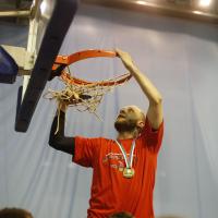 По традиции после победы по итогам сезона чемпионы срезали сетку с баскетбольного кольца на память.